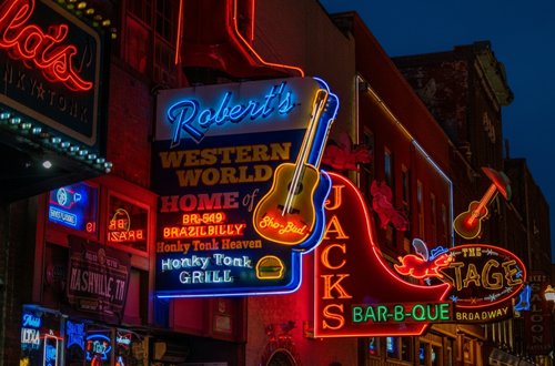 Lower Broadway (the Honky Tonk Highway) is the beating heart of Nashville. Music starts as early as 10 a.m. and never stops. Iconic venues include: Tootsie’s Orchid Lounge (the most famoust) and Robert’s Western World (for its authentic atmosphere and its “Recession Specials”).